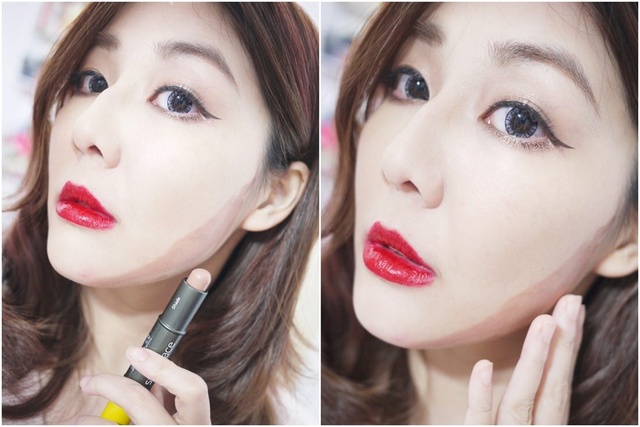 深色的地方就塗在腮幫子跟下巴處再用手或是搭配棉墊推開就能夠輕鬆打造出小V臉囉!